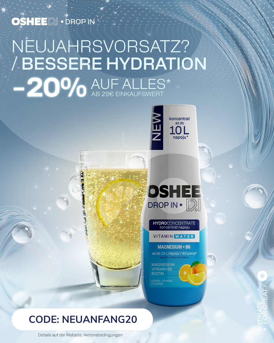 OSHEE Drop In ist die neue Art der Flüssigkeitszufuhr, die auf der Expertise und Erfahrung der Marke OSHEE basiert. Es sind funktionelle Getränke, die Sie bereits kennen, jedoch in Form von Hydrokonzentraten, die einfach zu verwenden sind – fügen Sie einfach die richtige Menge zu Sprudelwasser oder stilles Wasser hinzu. Getränke mit Elektrolyten und Vitaminen im Hydrokonzentrat OSHEE DROP IN sind eine Alternative zu abgefüllten Produkten.